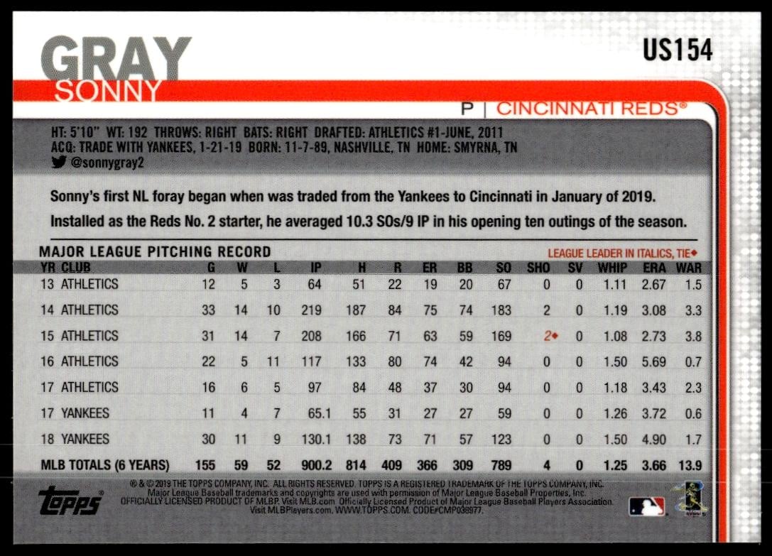 This BaseballΒ card, from 2019 is part of the Topps On Demand 3DΒ card set. Sonny Gray is featured and has a card number of US154.