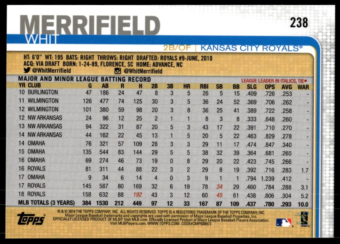 This Baseball card, from 2019 is part of the Topps On Demand 3D card set. Whit Merrifield is featured and has a card number of 238.