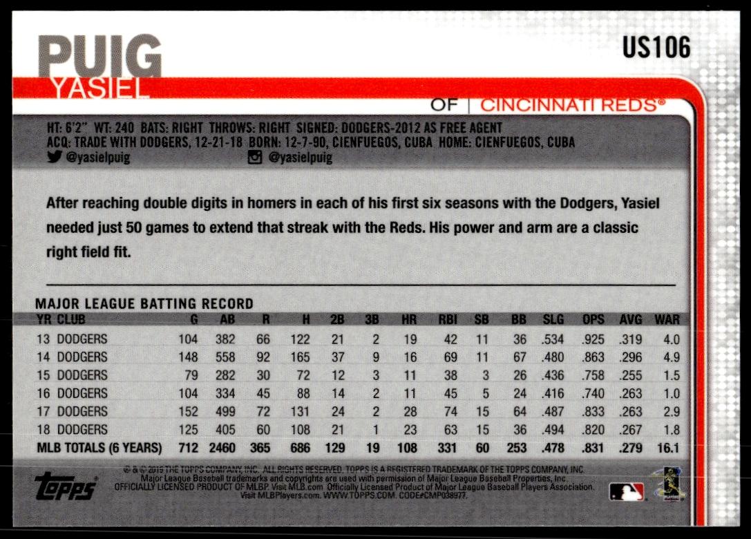This Baseball card, from 2019 is part of the Topps On Demand 3D card set. Yasiel Puig is featured and has a card number of US206.