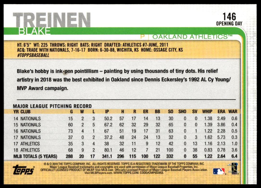 This BaseballΒ card, from 2019 is part of the Topps Series 1Β card set. Blake Treinen is featured and has a card number of 146.