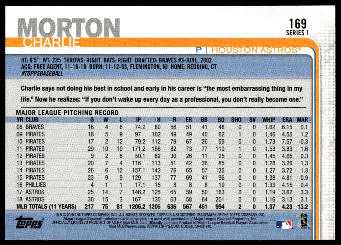 This BaseballΒ card, from 2019 is part of the Topps Series 1Β card set. Charlie Morton is featured and has a card number of 169.