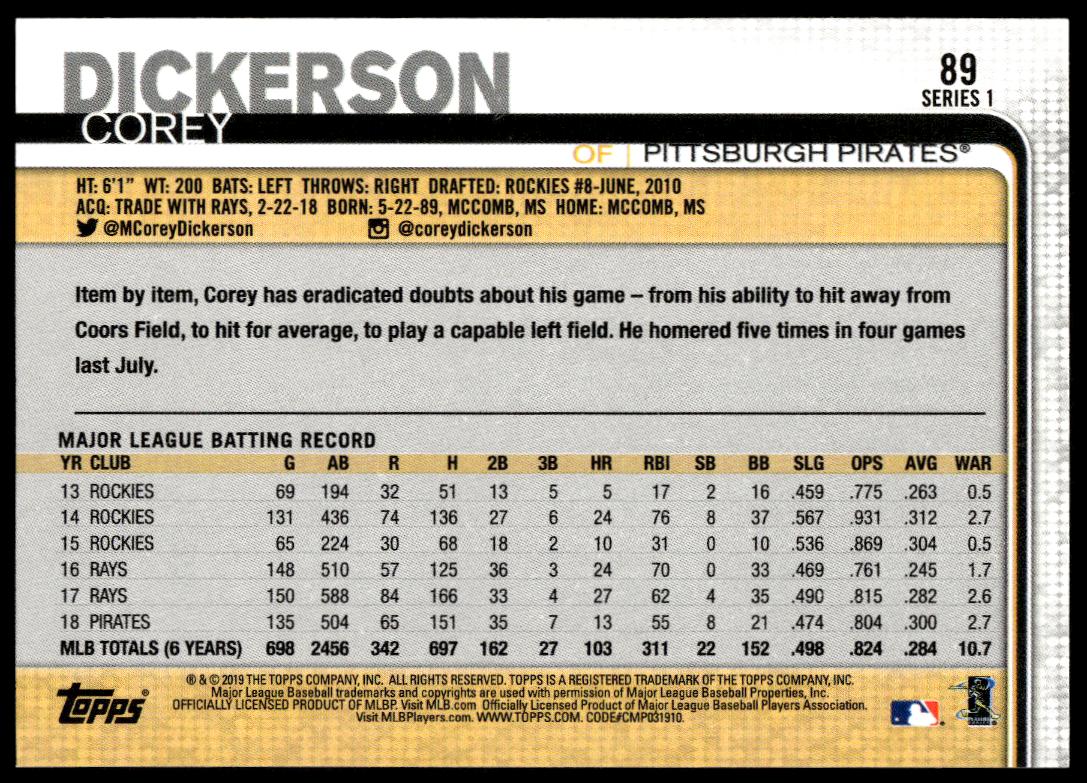 This BaseballΒ card, from 2019 is part of the Topps Series 1Β card set. Corey Dickerson is featured and has a card number of 89.