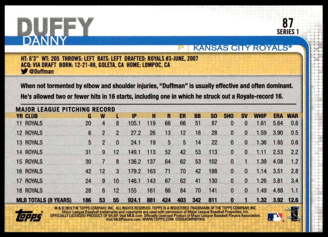 This BaseballΒ card, from 2019 is part of the Topps Series 1Β card set. Danny Duffy is featured and has a card number of 87.