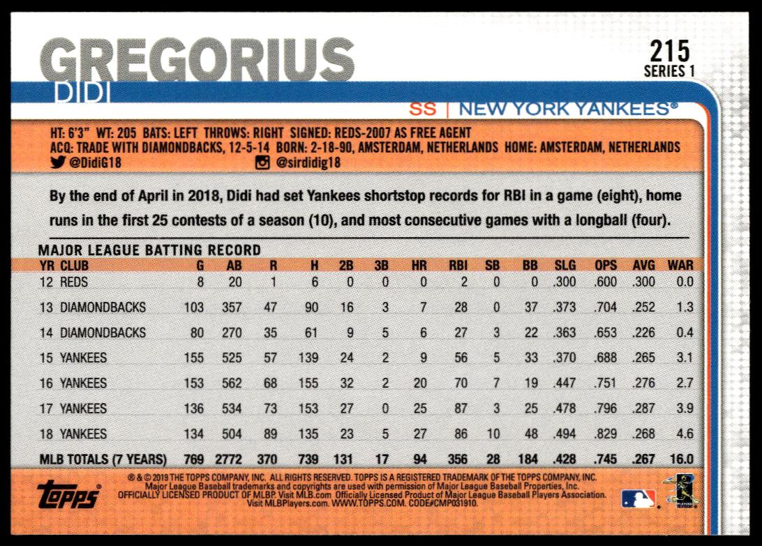 This Baseball card, from 2019 is part of the Topps Series 1 card set. Didi Gregorius is featured and has a card number of 53.