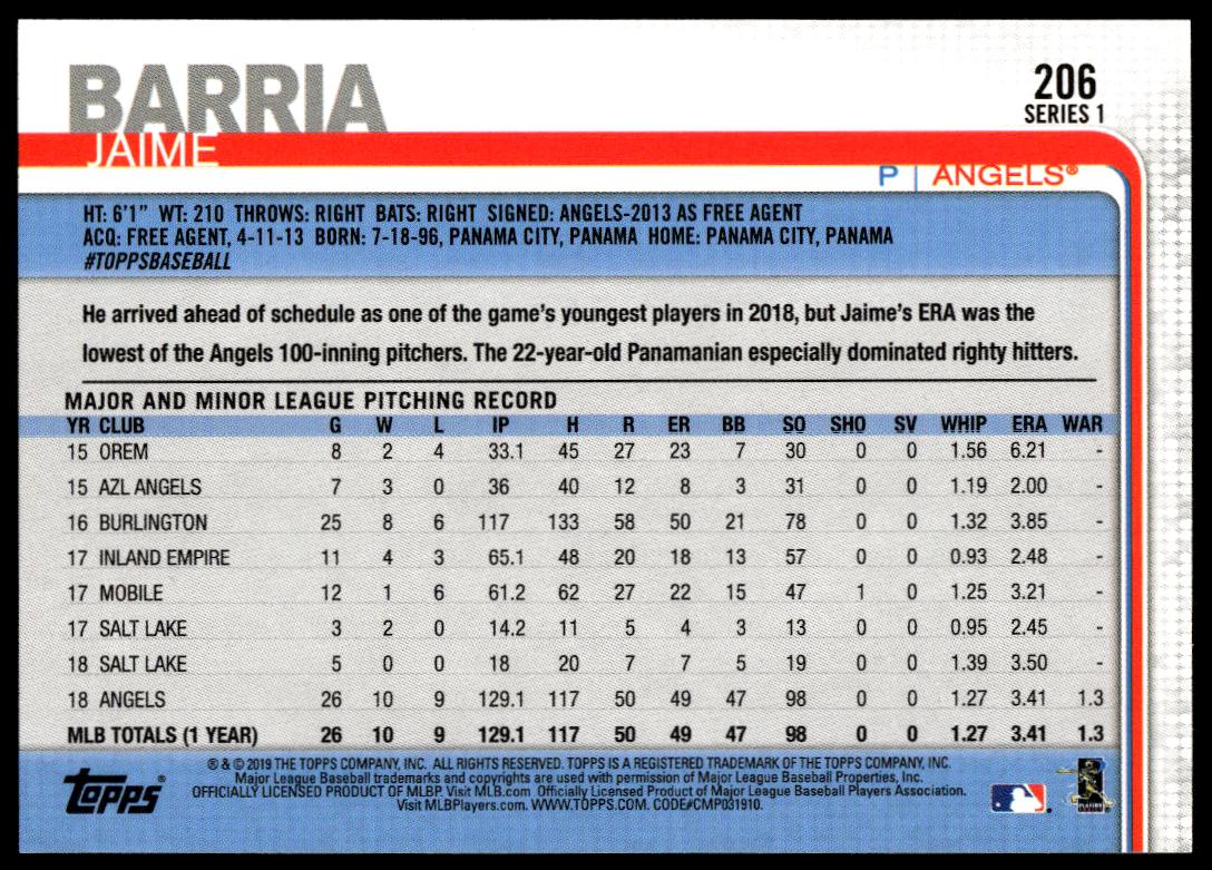 This BaseballΒ card, from 2019 is part of the Topps Series 1Β card set. Jaime Barria is featured and has a card number of 206.