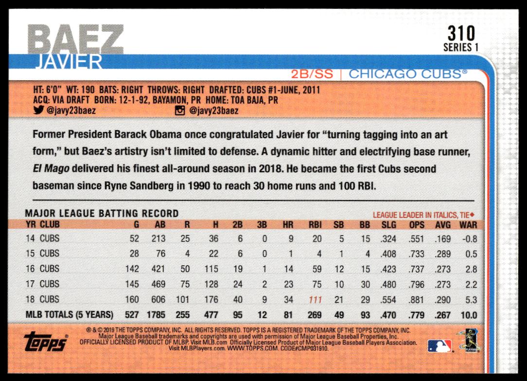 This BaseballΒ card, from 2019 is part of the Topps Series 1Β card set. Javier Baez is featured and has a card number of 310.