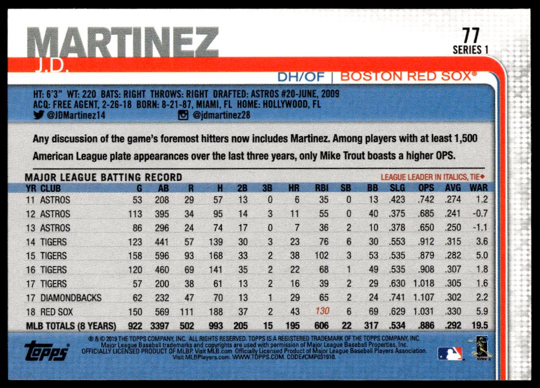 This BaseballΒ card, from 2019 is part of the Topps Series 1Β card set. J.D. Martinez is featured and has a card number of 77.