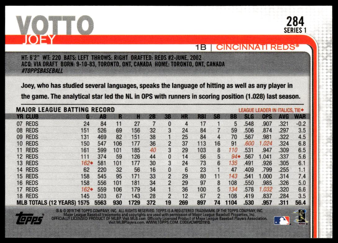 This Baseball card, from 2019 is part of the Topps Series 1 card set. Joey Votto is featured and has a card number of 284.