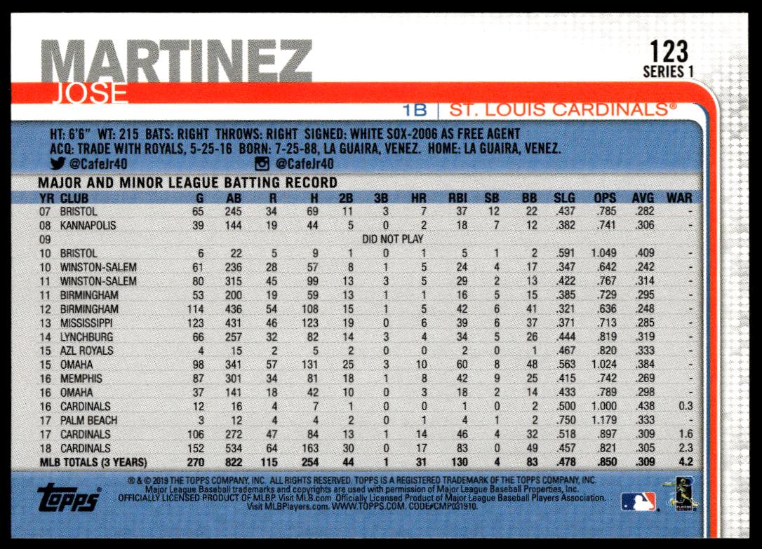 This BaseballΒ card, from 2019 is part of the Topps Series 1Β card set. Jose Martinez is featured and has a card number of 123.