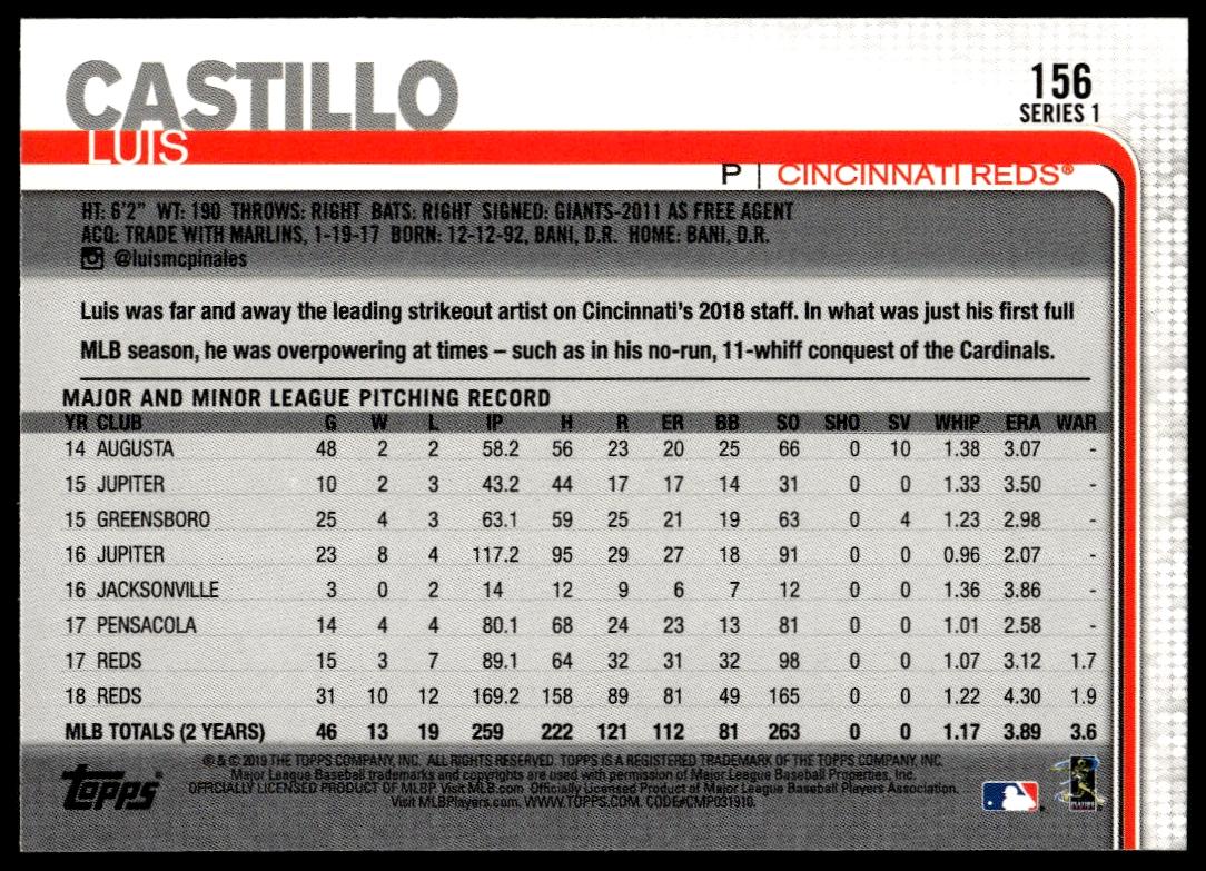 This BaseballΒ card, from 2019 is part of the Topps Series 1Β card set. Luis Castillo is featured and has a card number of 156.