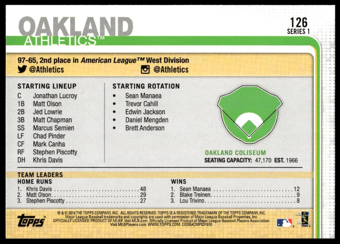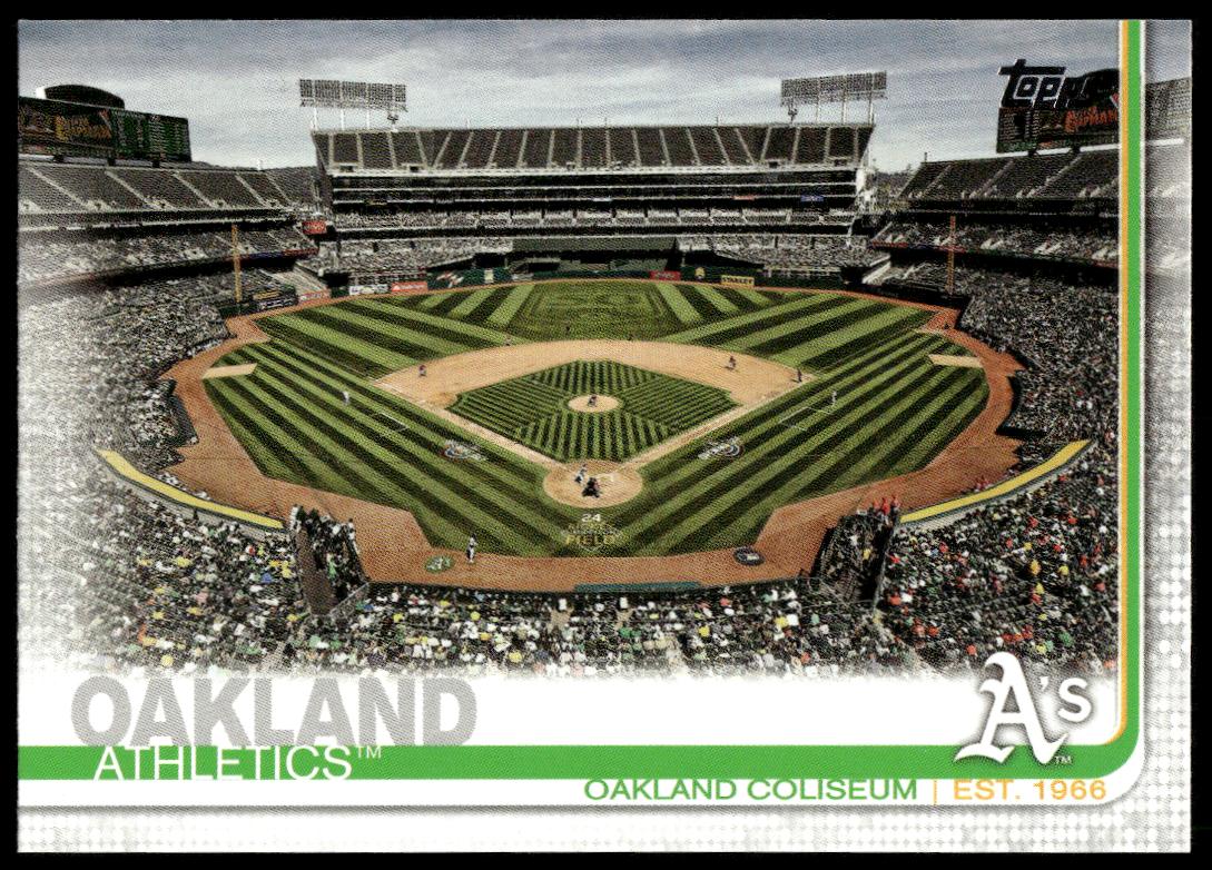 This Baseball card, from 2019 is part of the Topps Series 1 card set. Oakland Coliseum is featured and has a card number of 126.