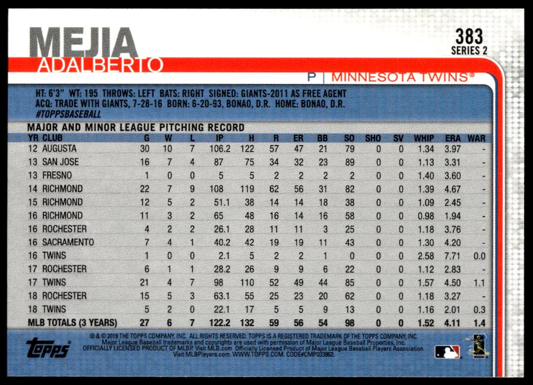 This BaseballΒ card, from 2019 is part of the Topps Series 2Β card set. Adalberto Mejia is featured and has a card number of 383.