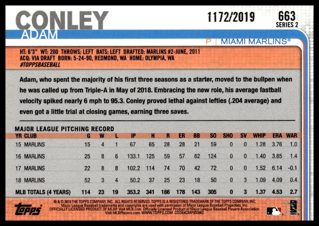This BaseballΒ card, from 2019 is part of the Topps Series 2Β card set. Adam Conley is featured and has a card number of 663.