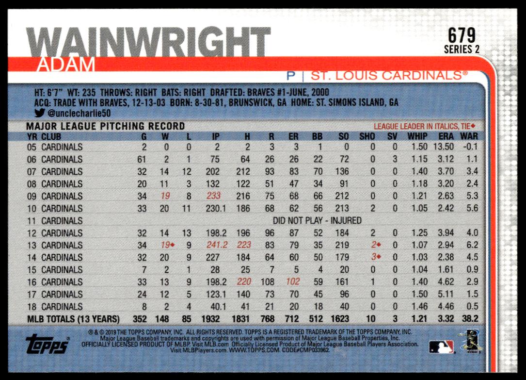 This Baseball card, from 2019 is part of the Topps Series 2 card set. Adam Wainwright is featured and has a card number of 679.