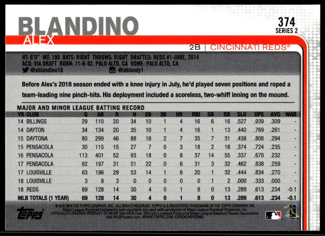 This BaseballΒ card, from 2019 is part of the Topps Series 2Β card set. Alex Blandino is featured and has a card number of 374.