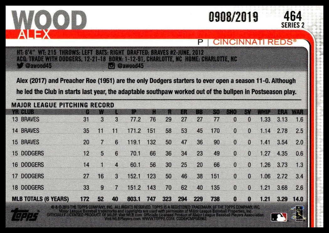 This BaseballΒ card, from 2019 is part of the Topps Series 2Β card set. Alex Wood is featured and has a card number of 464.