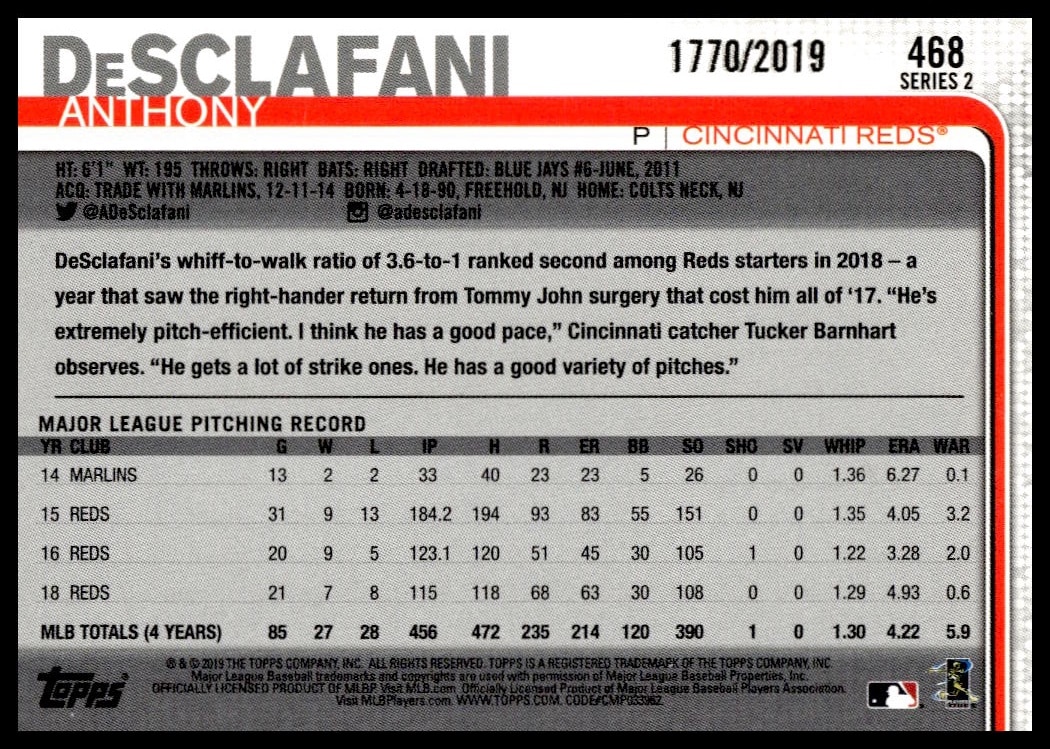 This Baseball card, from 2019 is part of the Topps Series 2 card set. Anthony DeSclafani is featured and has a card number of 468.