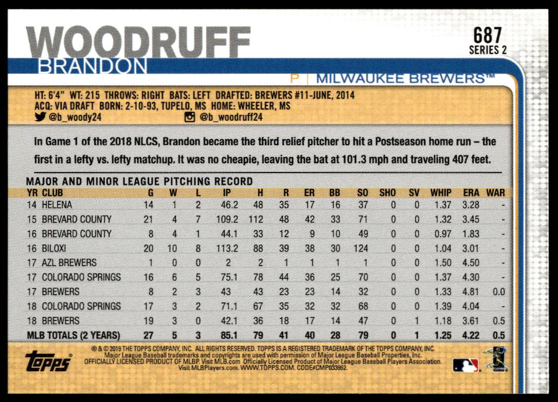This BaseballΒ card, from 2019 is part of the Topps Series 2Β card set. Brandon Woodruff is featured and has a card number of 687.