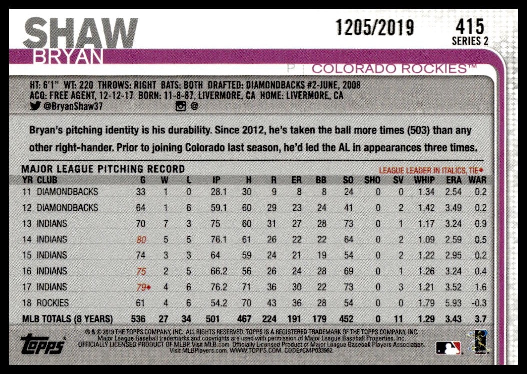 This Baseball card, from 2019 is part of the Topps Series 2 card set. Bryan Shaw is featured and has a card number of 415.