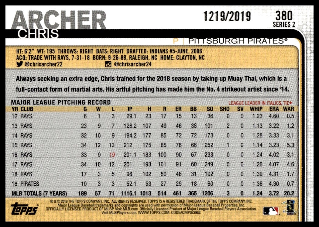 This BaseballΒ card, from 2019 is part of the Topps Series 2Β card set. Chris Archer is featured and has a card number of 380.