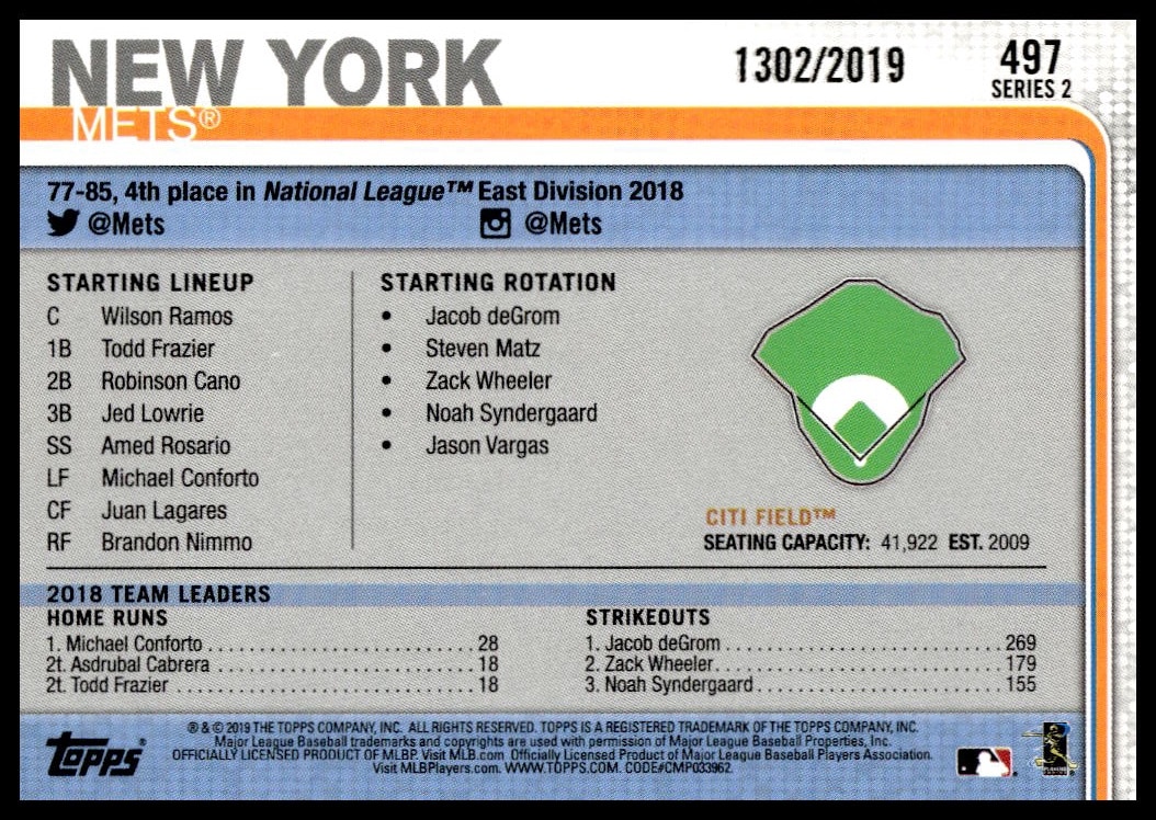 This Baseball card, from 2019 is part of the Topps Series 2 card set. Citi Field is featured and has a card number of 497.