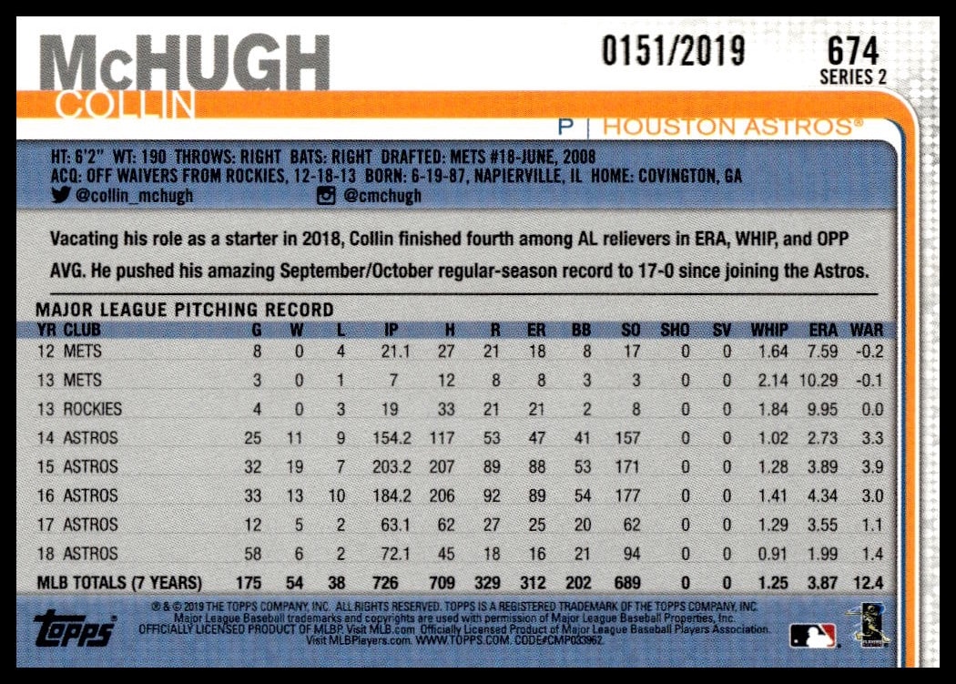 This BaseballΒ card, from 2019 is part of the Topps Series 2Β card set. Collin McHugh is featured and has a card number of 674.