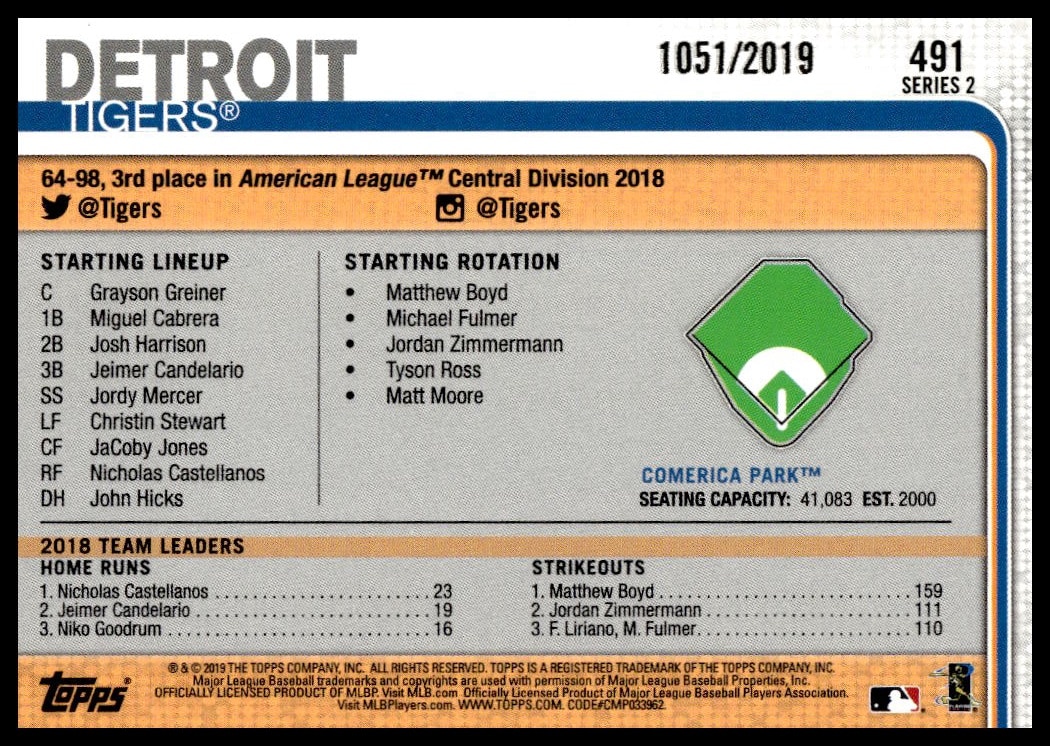 This Baseball card, from 2019 is part of the Topps Series 2 card set. Comerica Park is featured and has a card number of 491.