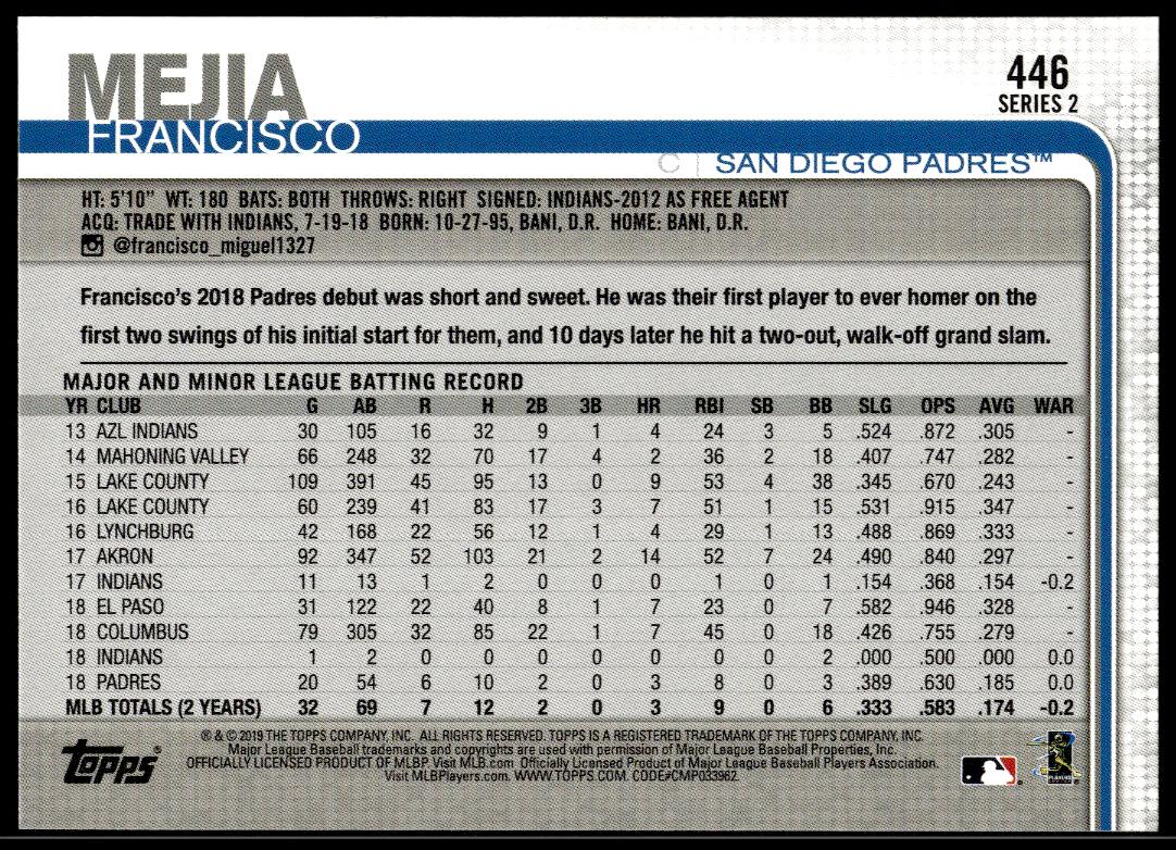 This Baseball card, from 2019 is part of the Topps Series 2 card set. Francisco Mejia is featured and has a card number of 446.