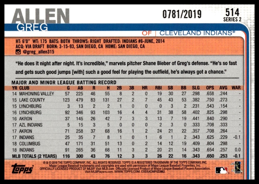 This Baseball card, from 2019 is part of the Topps Series 2 card set. Greg Allen is featured and has a card number of 514.