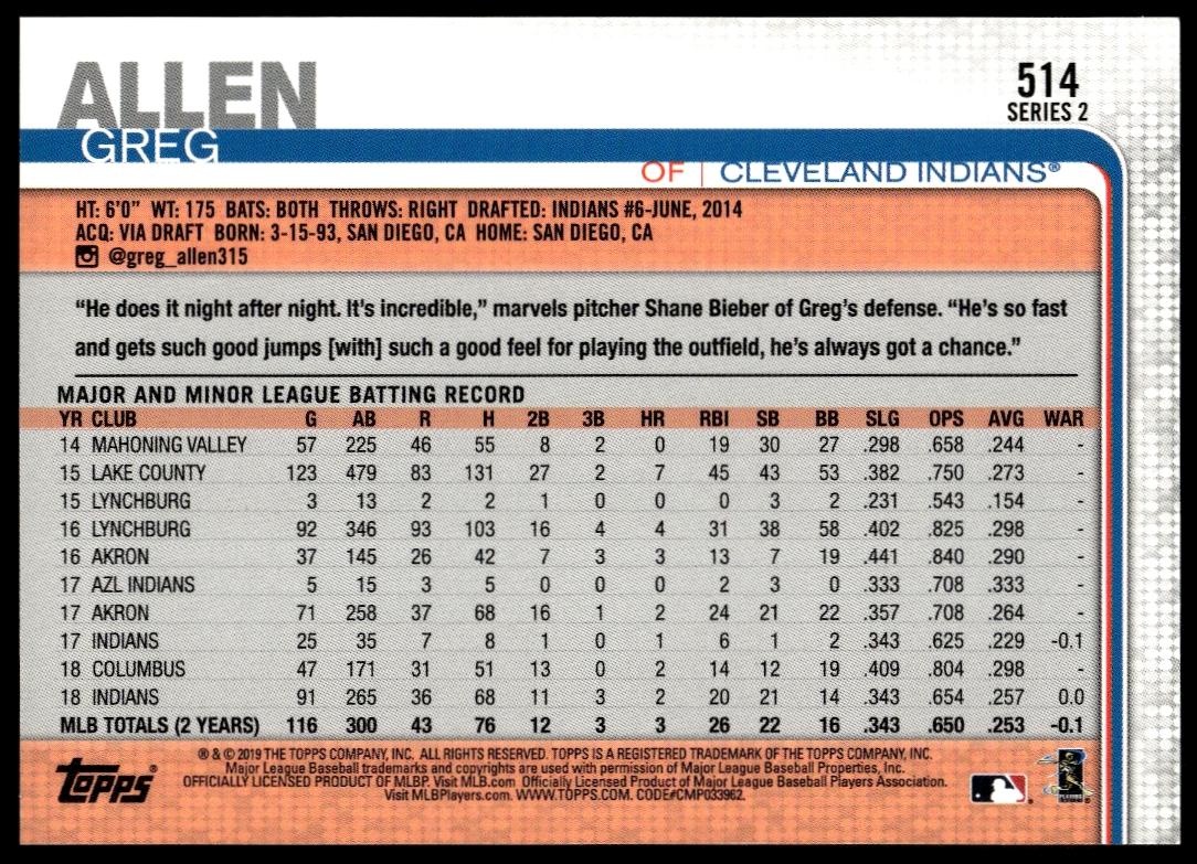 This Baseball card, from 2019 is part of the Topps Series 2 card set. Greg Allen is featured and has a card number of 514.
