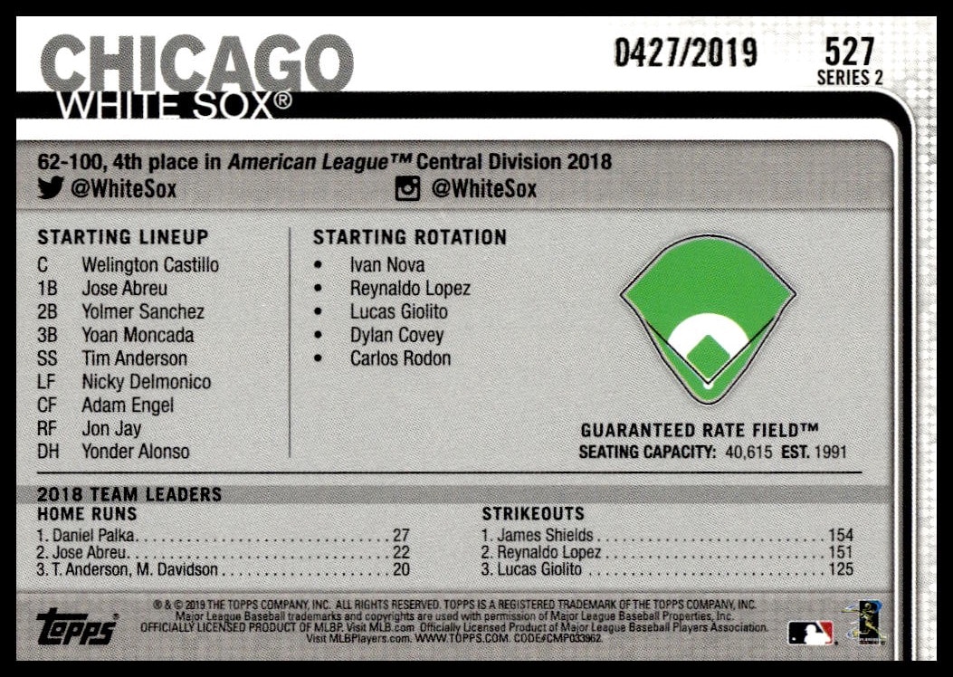 This Baseball card, from 2019 is part of the Topps Series 2 card set. Guaranteed Rate Field is featured and has a card number of 527.