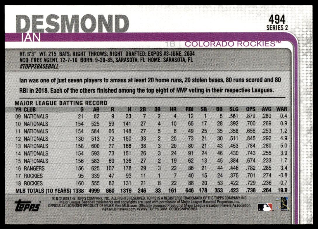 This BaseballΒ card, from 2019 is part of the Topps Series 2Β card set. Ian Desmond is featured and has a card number of 494.