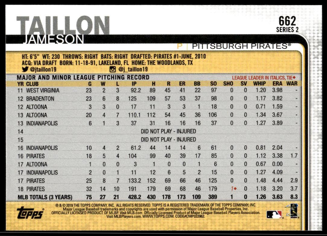 This BaseballΒ card, from 2019 is part of the Topps Series 2Β card set. Jameson Taillon is featured and has a card number of 662.