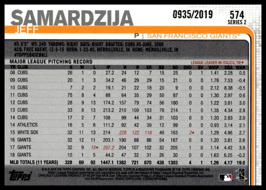 This BaseballΒ card, from 2019 is part of the Topps Series 2Β card set. Jeff Samardzija is featured and has a card number of 574.