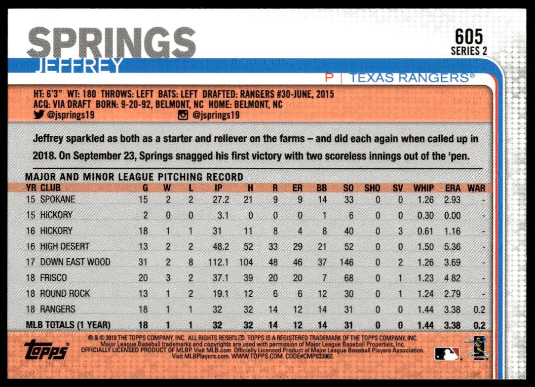 This BaseballΒ card, from 2019 is part of the Topps Series 2Β card set. Jeffrey Springs is featured and has a card number of 605.