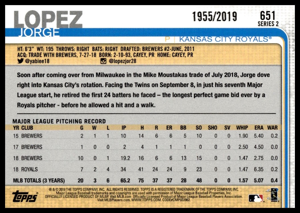 This Baseball card, from 2019 is part of the Topps Series 2 card set. Jorge Lopez is featured and has a card number of 651.