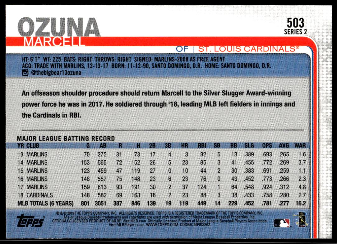 This Baseball card, from 2019 is part of the Topps Series 2 card set. Marcell Ozuna is featured and has a card number of 503.