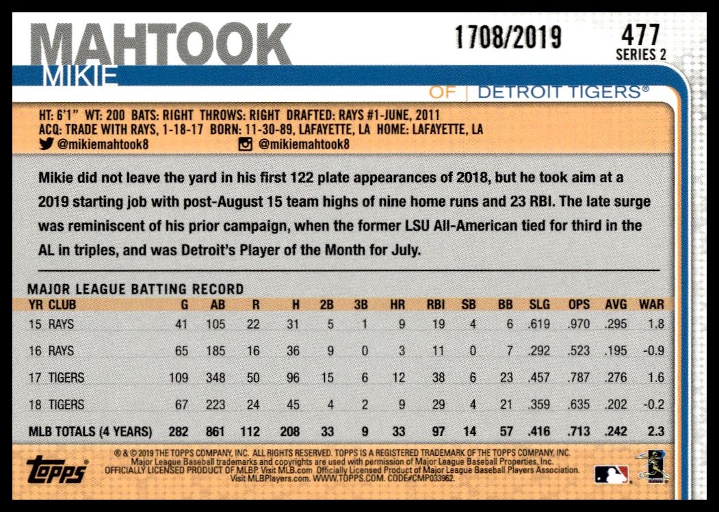 This BaseballΒ card, from 2019 is part of the Topps Series 2Β card set. Mikie Mahtook is featured and has a card number of 477.