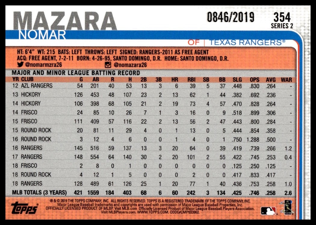 This Baseball card, from 2019 is part of the Topps Series 2 card set. Nomar Mazara is featured and has a card number of 354.