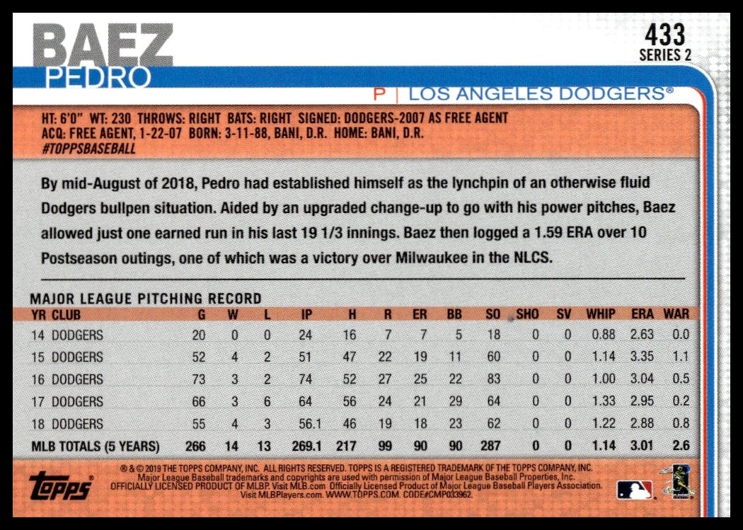 This Baseball card, from 2019 is part of the Topps Series 2 card set. Pedro Baez is featured and has a card number of 433.