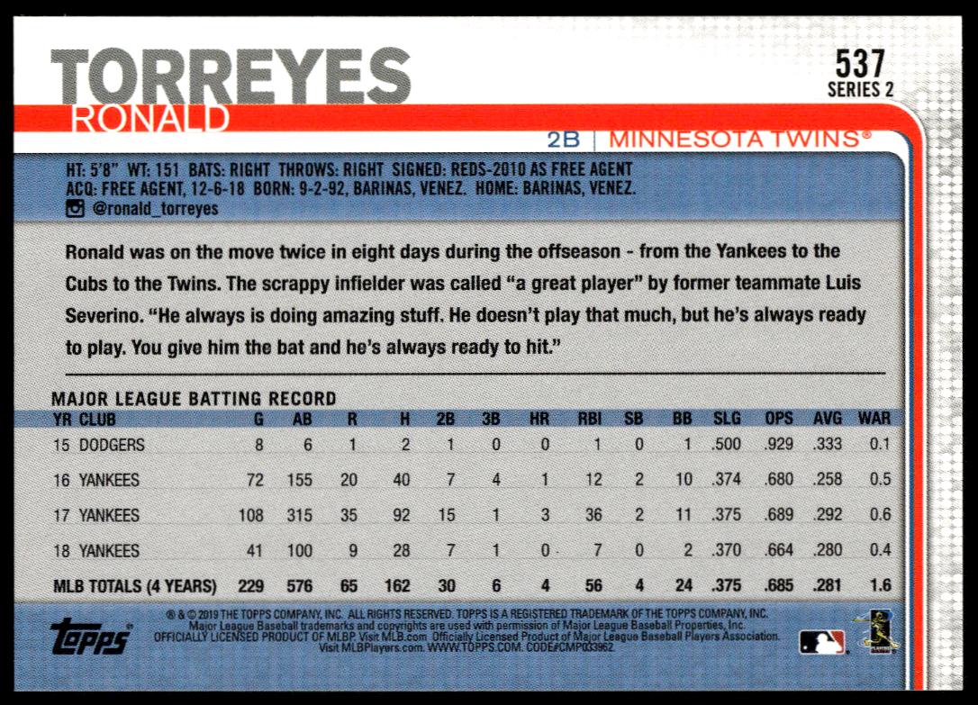 This Baseball card, from 2019 is part of the Topps Series 2 card set. Ronald Torreyes is featured and has a card number of 537.