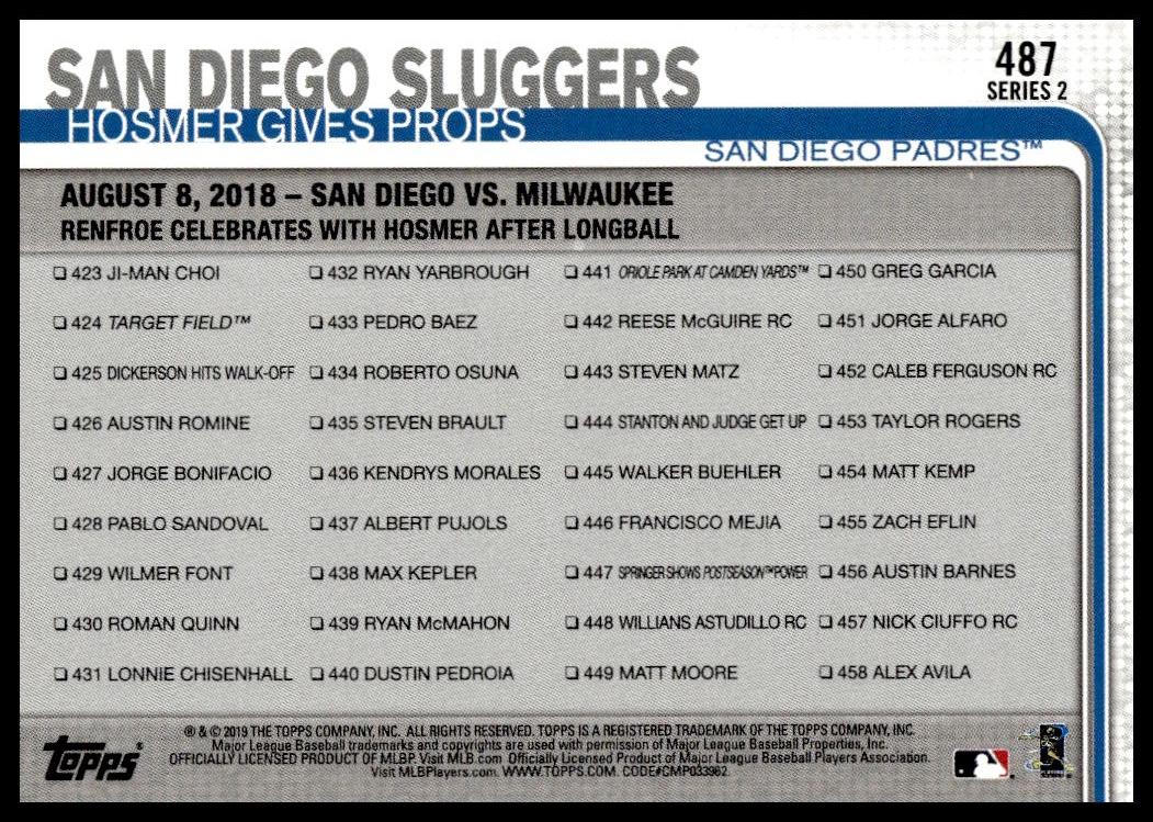 This Baseball card, from 2019 is part of the Topps Series 2 card set. San Diego Sluggers is featured and has a card number of 487.