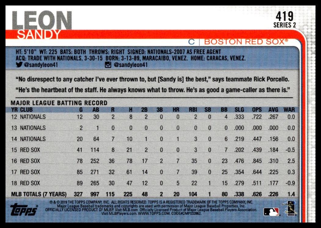 This Baseball card, from 2019 is part of the Topps Series 2 card set. Sandy Leon is featured and has a card number of 419.