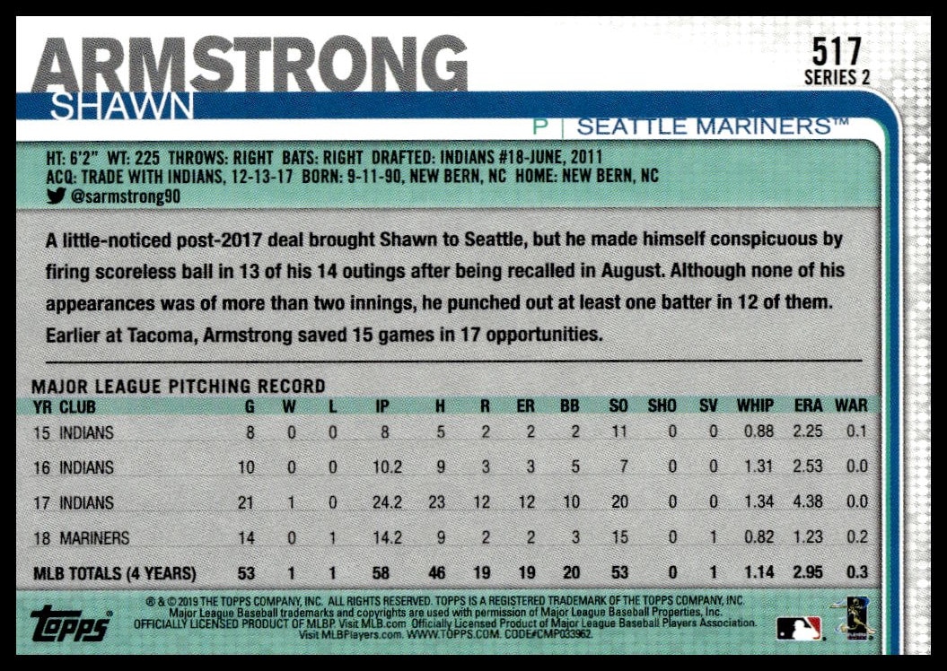 This Baseball card, from 2019 is part of the Topps Series 2 card set. Shawn Armstrong is featured and has a card number of 517.