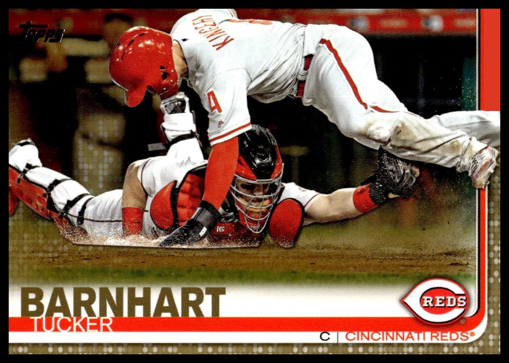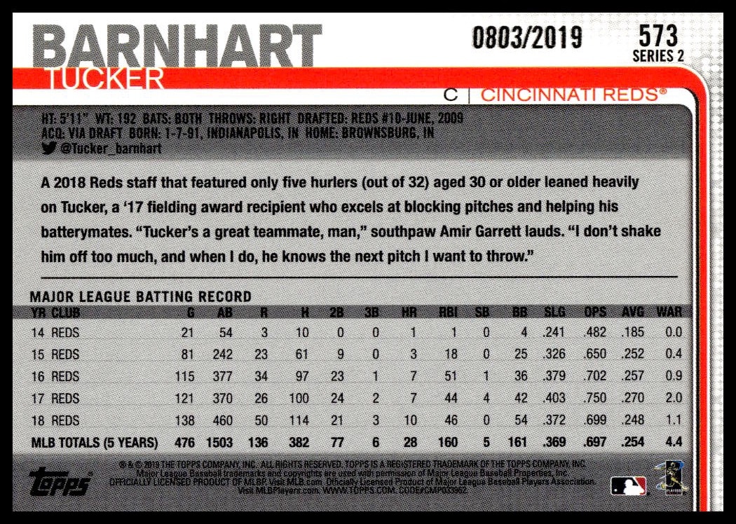 This Baseball card, from 2019 is part of the Topps Series 2 card set. Tucker Barnhart is featured and has a card number of 573.