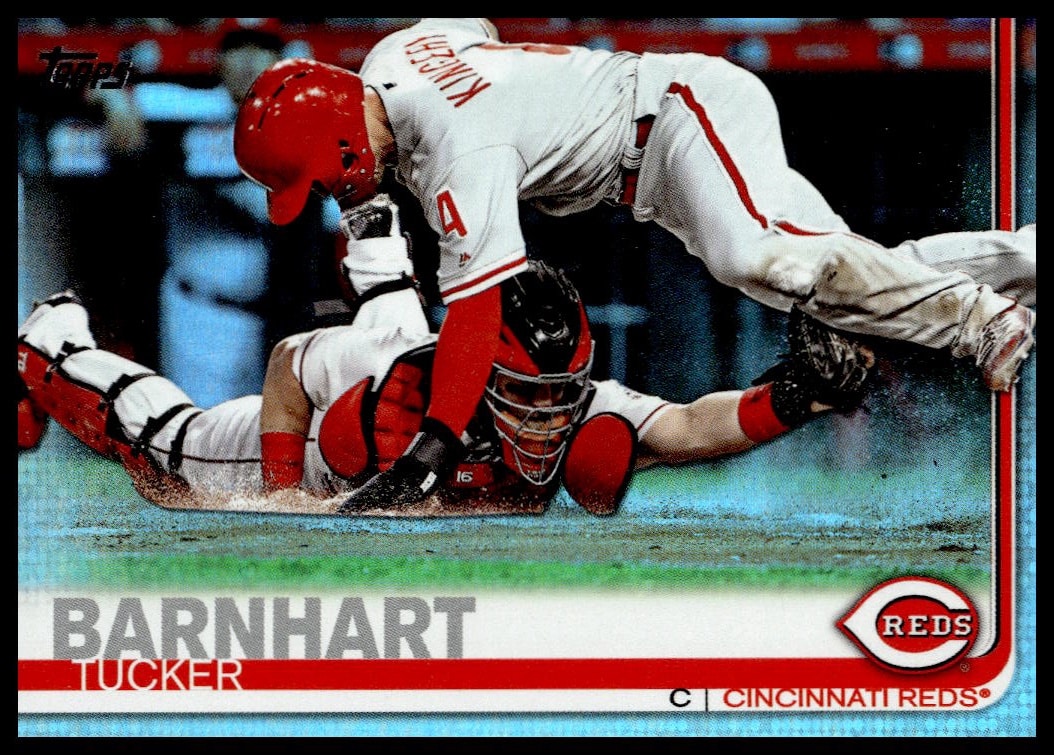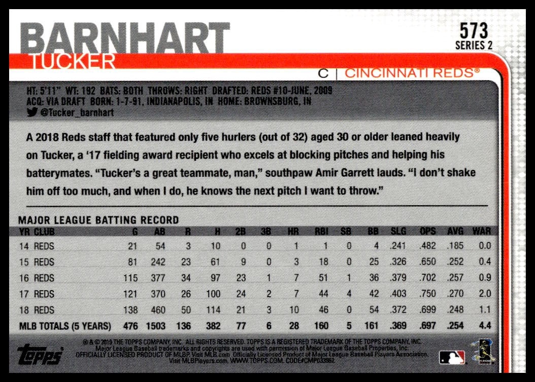This Baseball card, from 2019 is part of the Topps Series 2 card set. Tucker Barnhart is featured and has a card number of 573.