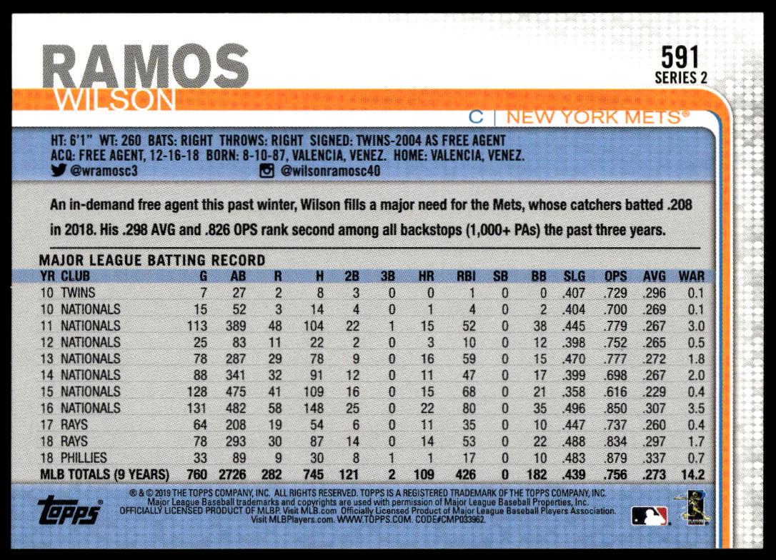 This BaseballΒ card, from 2019 is part of the Topps Series 2Β card set. Wilson Ramos is featured and has a card number of 591.