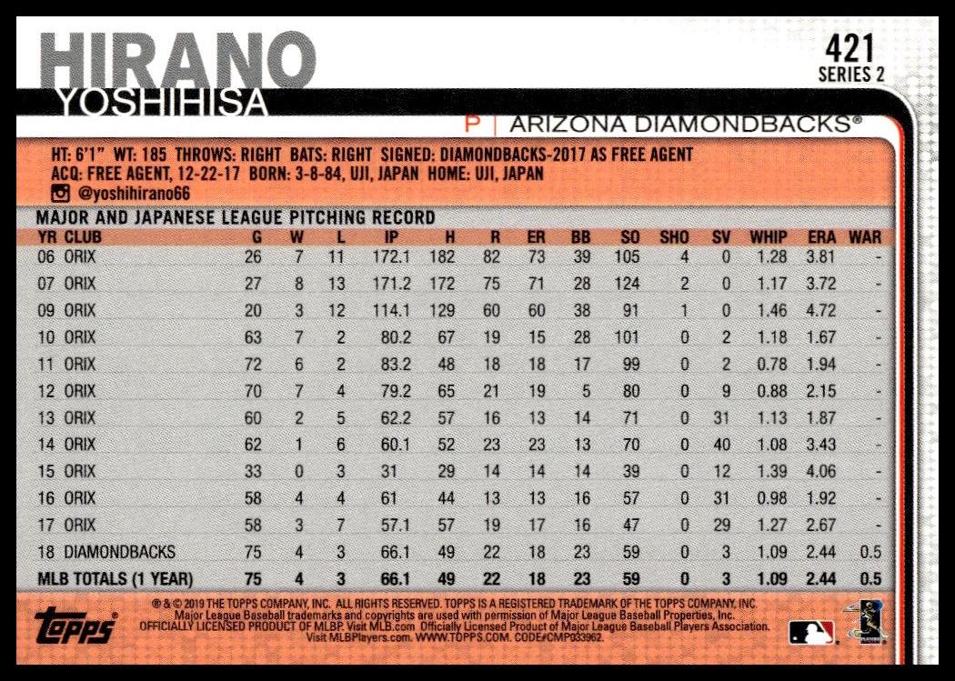 This Baseball card, from 2019 is part of the Topps Series 2 card set. Yoshihisa Hirano is featured and has a card number of 421.