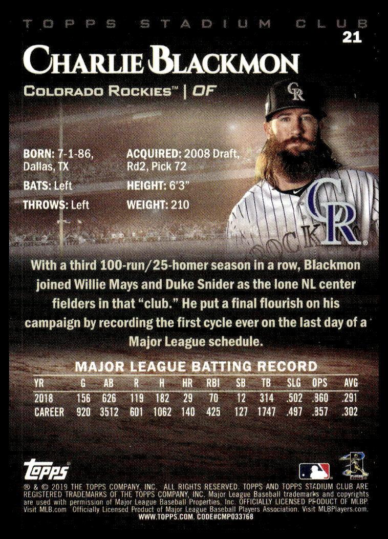 This Baseball card, from 2019 is part of the Topps Stadium Club card set. Charlie Blackmon is featured and has a card number of 21.