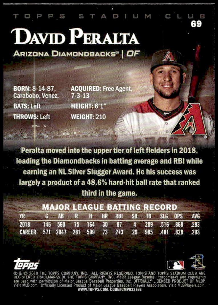 This Baseball card, from 2019 is part of the Topps Stadium Club card set. David Peralta is featured and has a card number of 69.